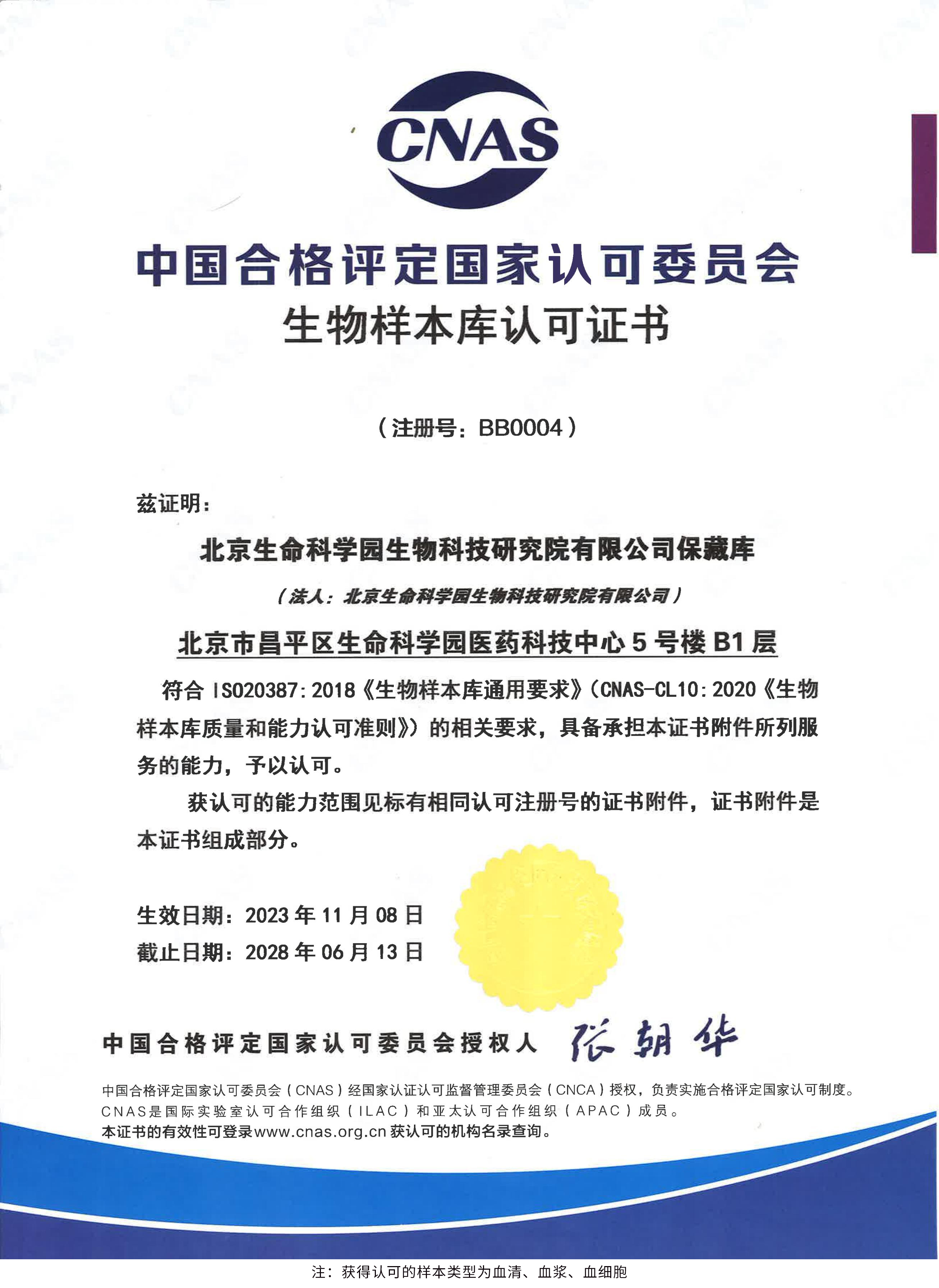 北京生命科學(xué)園生物科技研究院(以下簡(jiǎn)稱“北京生物樣本資源庫(kù)”)(Biobank of Life Science Park,簡(jiǎn)寫“BoLSP”)是一家由北京市科委和中關(guān)村生命科學(xué)園共同支持設(shè)立的第三方生物樣本庫(kù)公共服務(wù)平臺(tái),秉承北京重大疾病臨床數(shù)據(jù)和樣本資源庫(kù)(以下簡(jiǎn)稱“北京庫(kù)”)(Beijing Biobank of Clinical Resources,BBCR)十余年的發(fā)展成果,聚合眾多臨床樣本專家的專業(yè)共識(shí),致力于在生命科學(xué)、生物醫(yī)藥研究領(lǐng)域發(fā)揮銜接樣本資源持有者與研究者的橋梁作用,解決生物樣本資源開(kāi)發(fā)上下游信息不對(duì)稱、資源共享困難等問(wèn)題。研究院在北京中關(guān)村生命科學(xué)園昌平園區(qū)建立了2000㎡生物樣本庫(kù),最大存儲(chǔ)規(guī)模達(dá)1000萬(wàn)份。研究院遵循CNAS-CL10:2020《生物樣本庫(kù)質(zhì)量和能力認(rèn)可準(zhǔn)則》,同時(shí)結(jié)合北京庫(kù)過(guò)去十年的工作經(jīng)驗(yàn)與教訓(xùn),建立了一套完善的生物樣本保藏質(zhì)量管理體系,從人、機(jī)、料、法、環(huán)、控多個(gè)角度,實(shí)現(xiàn)生物樣本保藏過(guò)程的全面質(zhì)量控制,先后獲得國(guó)家科技部頒發(fā)的人類遺傳資源保藏行政許可證書和中國(guó)合格評(píng)定國(guó)家認(rèn)可委員會(huì)(China National Accreditation Service for Conformity Assessment,CNAS)頒發(fā)的“CNAS認(rèn)可證書”。